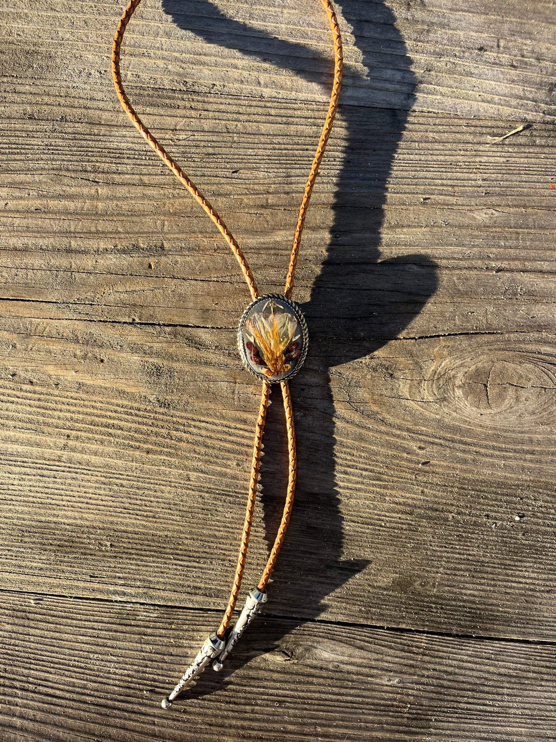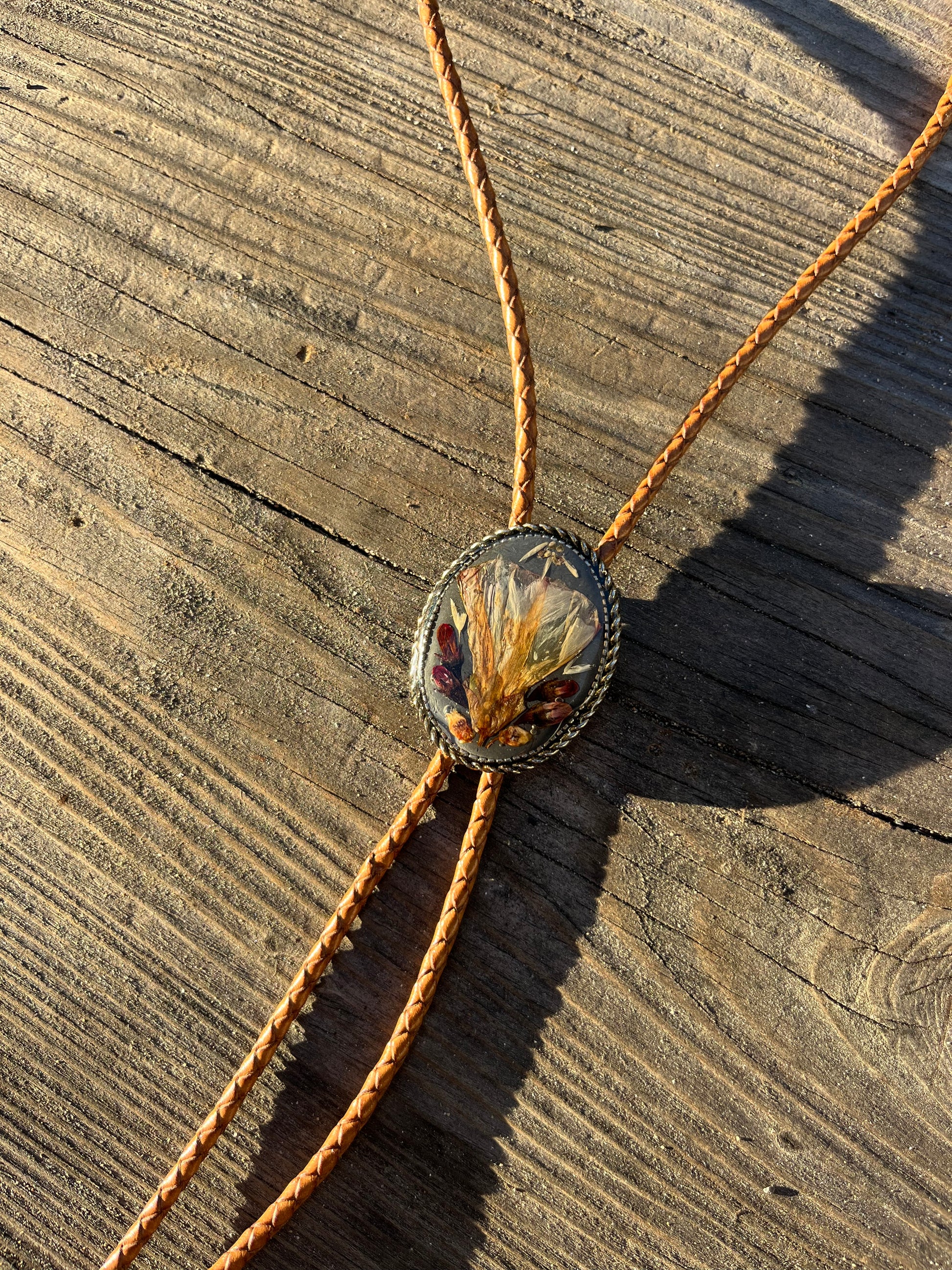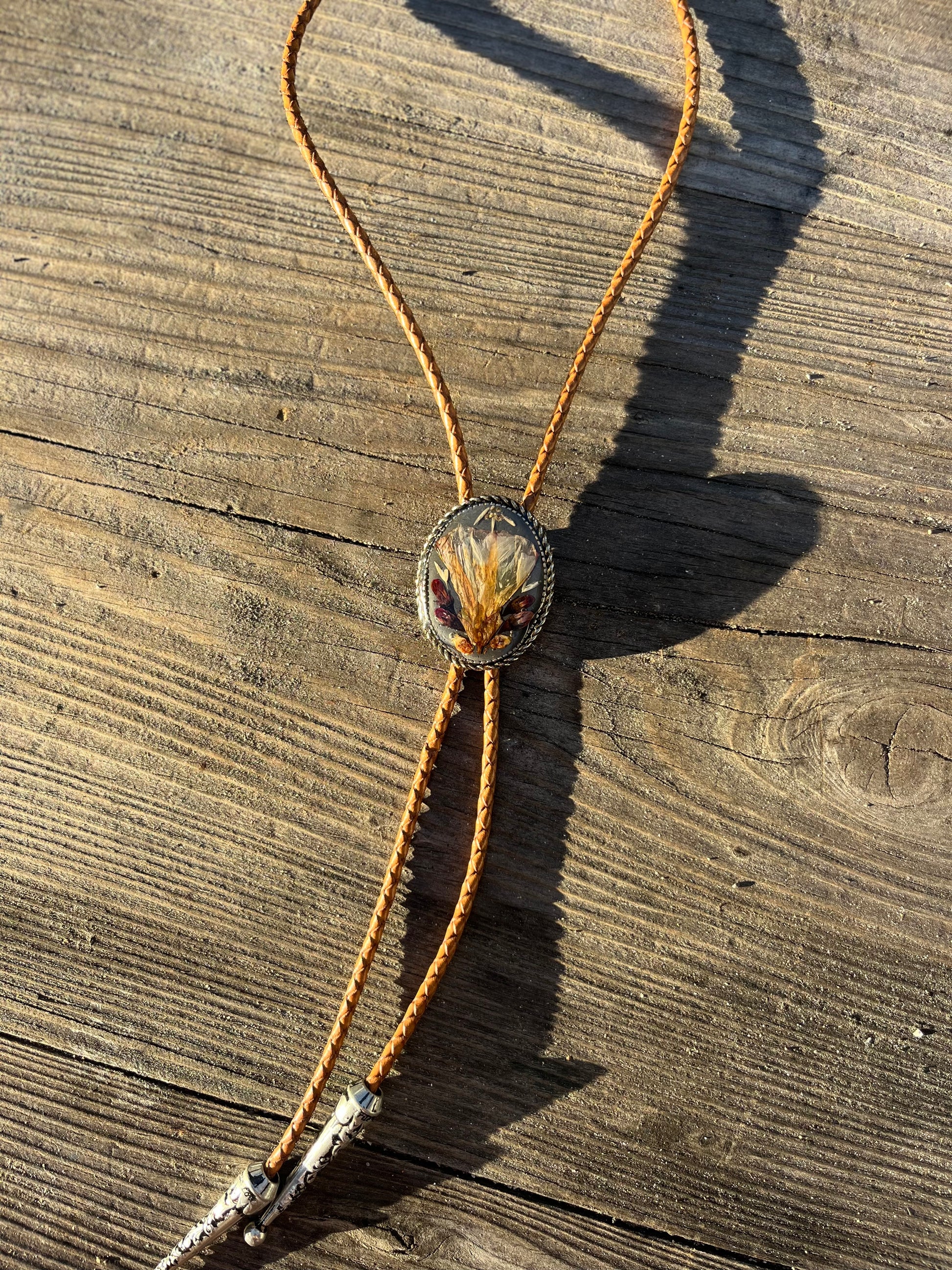 Handmade mix of spring wildflowers collected in April 2025 in the central coast on 2mm leather cording, classic bolo style. Expect slight variations from photos due to lighting and the camera not fully capturing their rawest beauty!