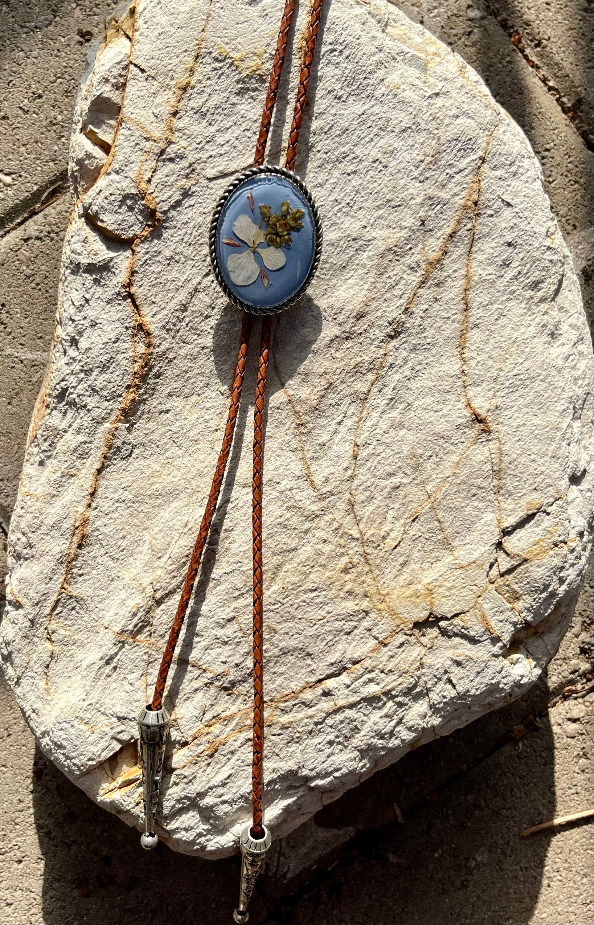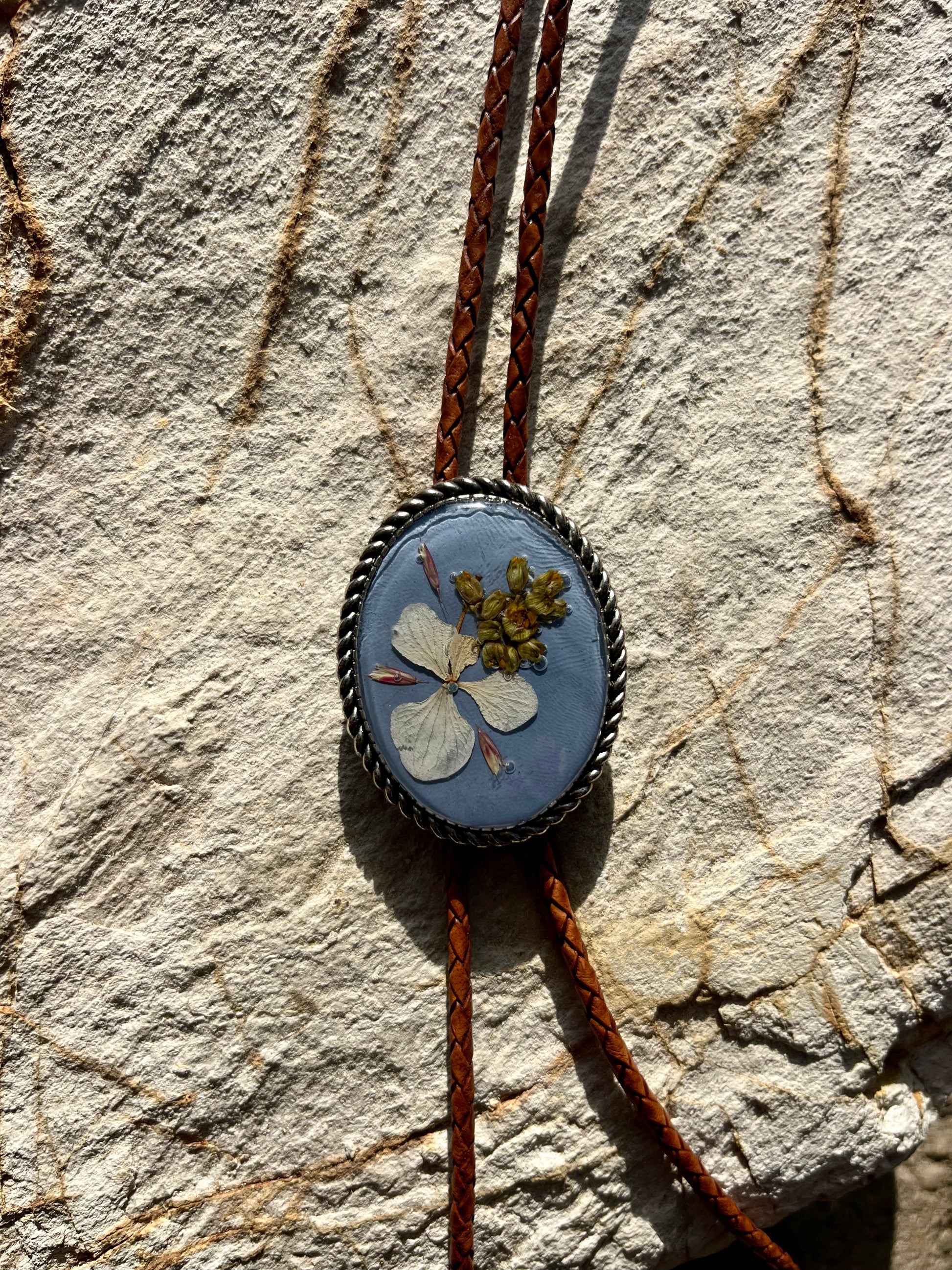 Handmade mix of spring wildflowers collected in April 2025 in the central coast on 2mm leather cording, classic bolo style. Expect slight variations from photos due to lighting and the camera not fully capturing their rawest beauty!