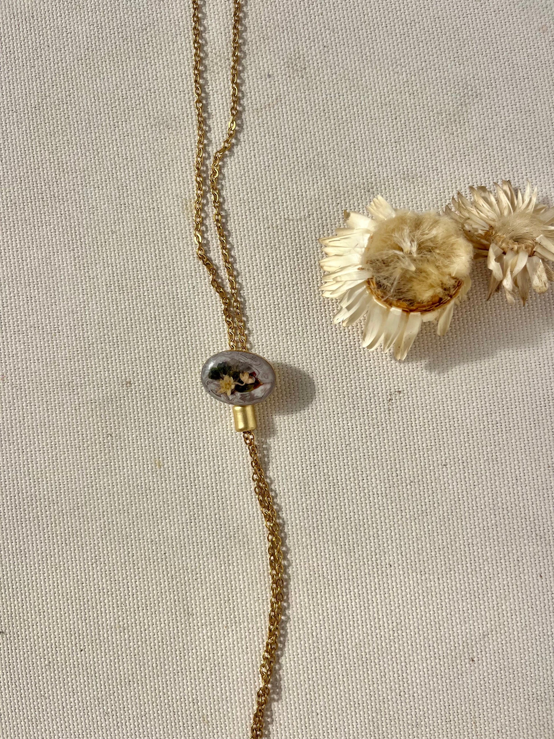 2mm gold filled bolo chain with 18X13mm plant filled bezel. I collected and preserved these wildflowers in the central coast. A start to finish operation. Each piece is unique and handmade. Expect slight variations. I have tried to capture their colors as close to real life as possible. They are, however, even more vibrant and luminescent in real life than on a screen.