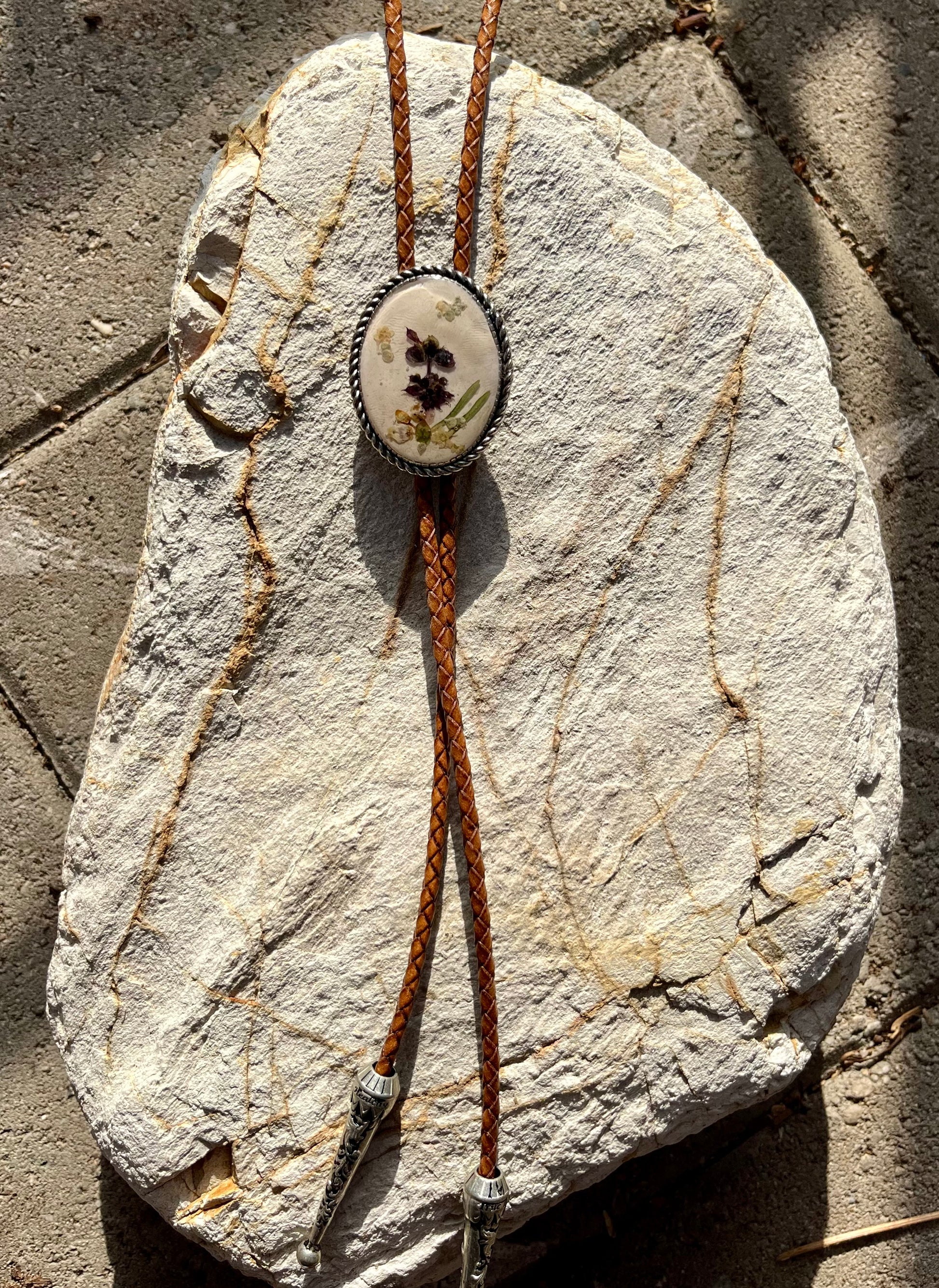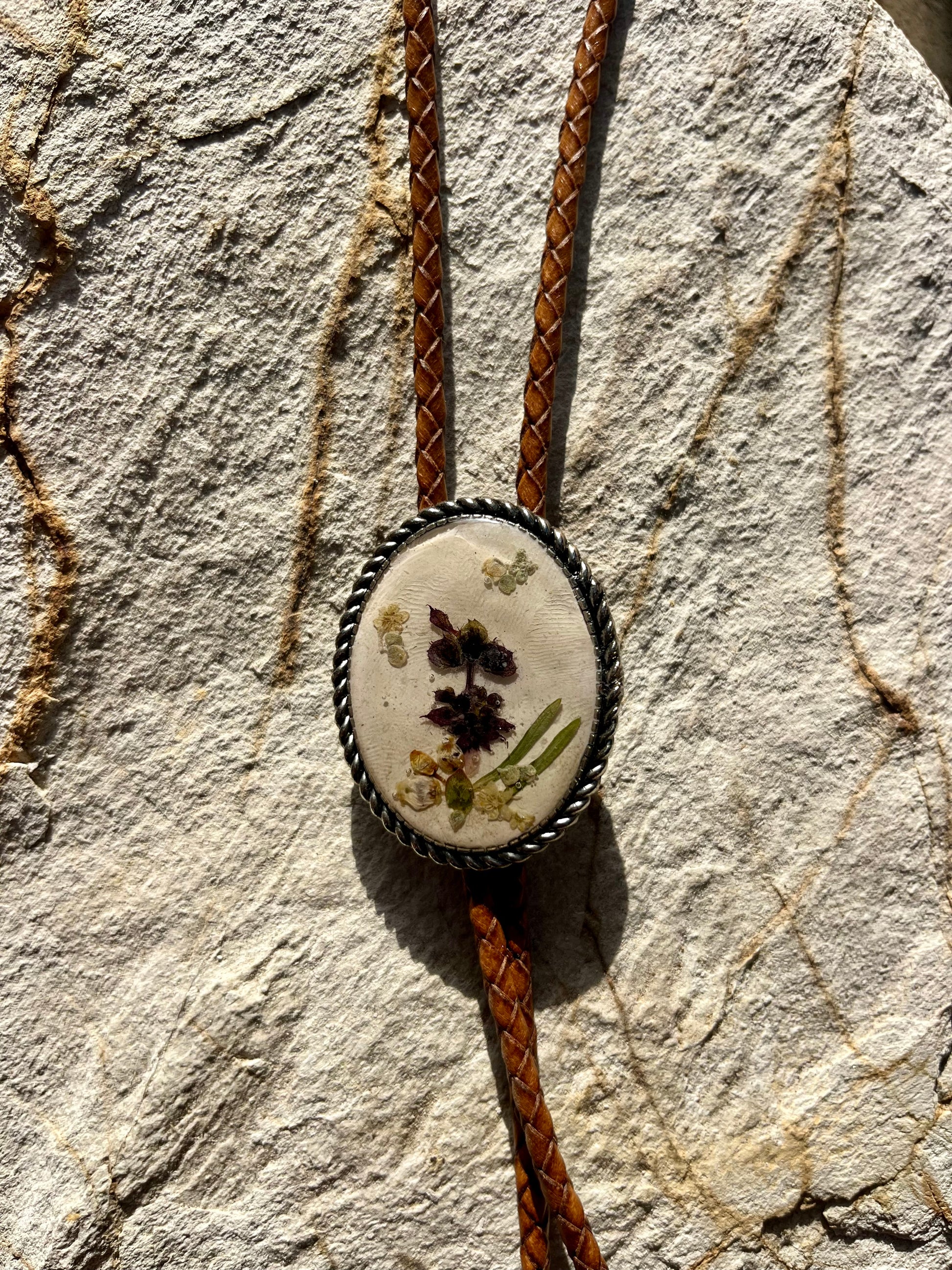 Handmade mix of spring wildflowers collected in April 2025 in the central coast on 2mm leather cording, classic bolo style. Expect slight variations from photos due to lighting and the camera not fully capturing their rawest beauty!