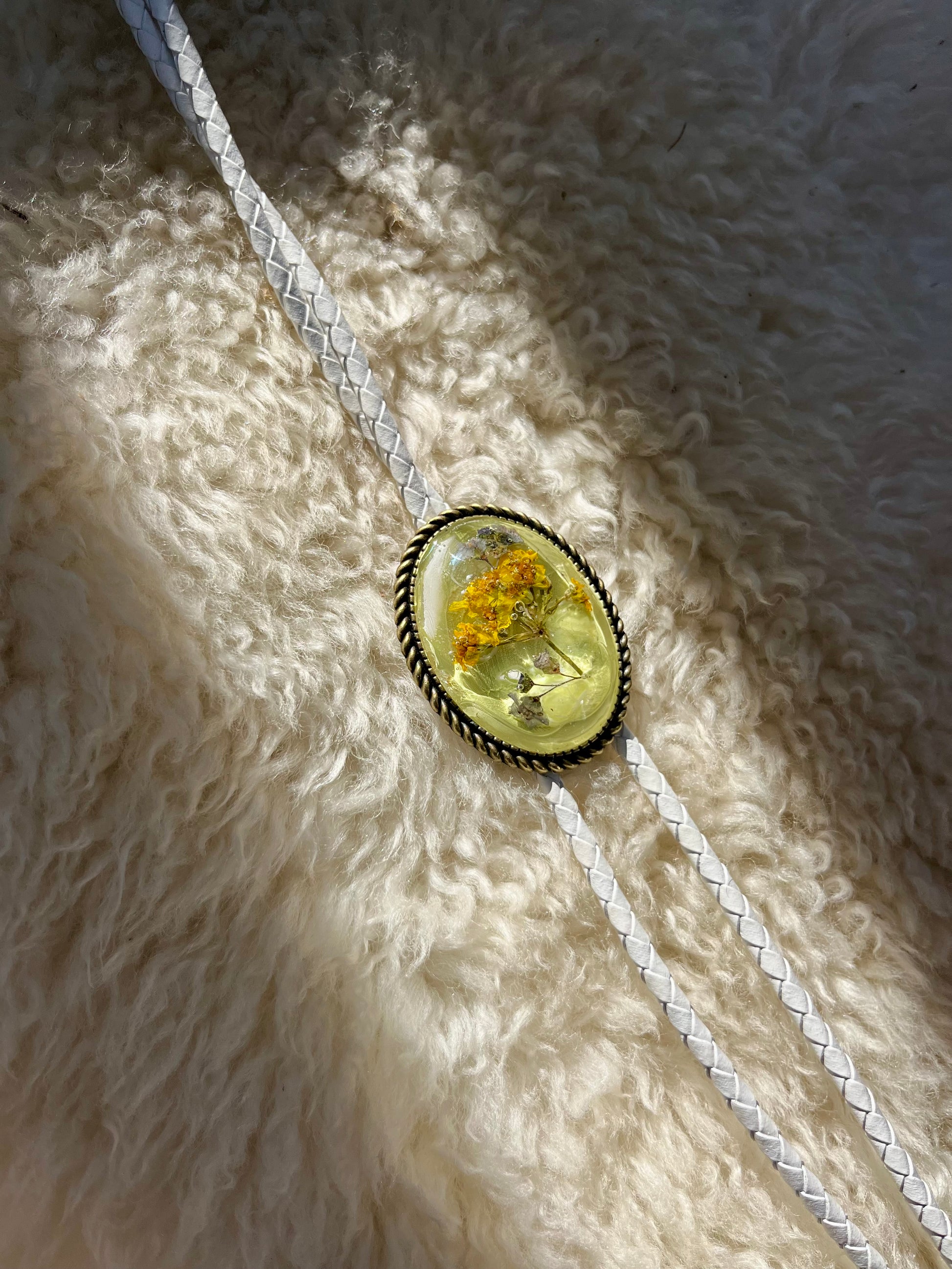 Handmade mix of spring wildflowers, wild golden yarrow, collected in April 2025 in the central coast on 2mm leather cording, classic bolo style. Expect slight variations from photos due to lighting and the camera not fully capturing their rawest beauty!